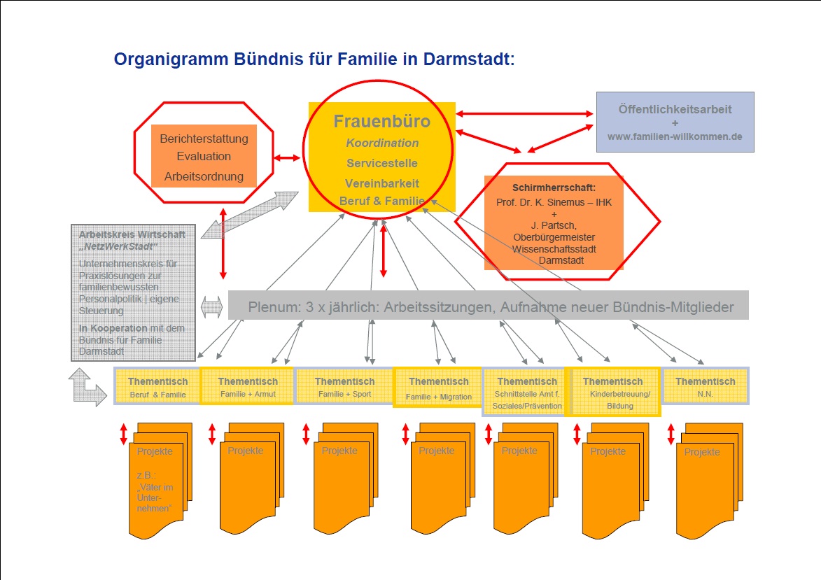 Die bundesweite Erfahrung zeigt, dass Bündnisse am produktivsten und nachhaltigsten arbeiten können, wenn nicht jeder Schritt "verregelt" ist. Der Arbeitsordnung des Darmstädter Bündnisses umreißt daher nur einige Eckpunkte: Ziele, Organigramm, Rolle des Frauenbüros als koordinierende Stelle, Rolle des Plenums und der Thementische, Kommunikationsflüsse innerhalb des Bündnisses, projektorientiertes Arbeiten. | |||||